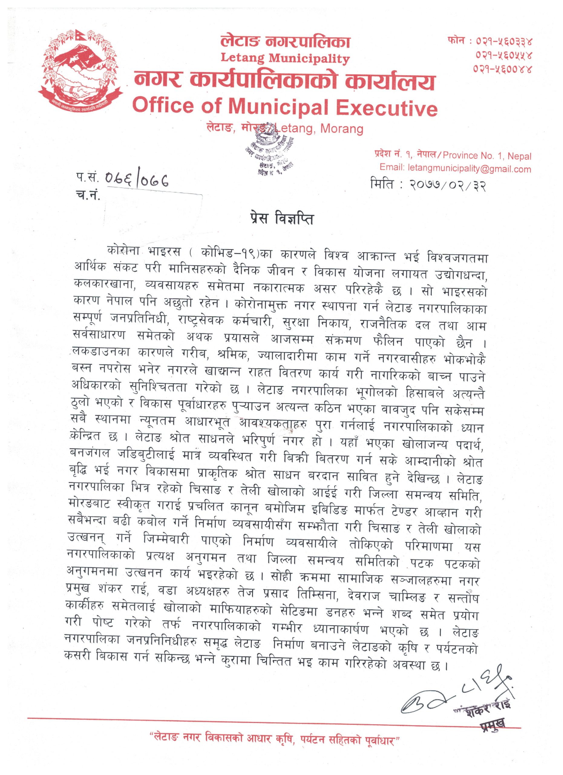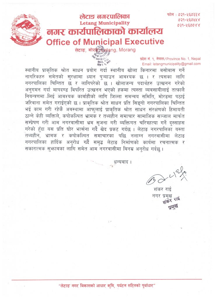 आइतबार नगर प्रमुख शंकर राईले प्रेस विज्ञप्ति सार्वजनिक गर्दै आफ्नो र केही वडाध्यक्षको नाम जोडेर सामाजिक सञ्जालमा जथाभावि लेखेको विषयलाई खण्डन गर्नु भएको हो ।विज्ञप्तिमा लेटाङ नगरपालिकाका जनप्रतिनिधिहरू समृद्ध लेटाङ नगर निर्माण गर्न लेटाङको कृषि र पर्यटनको कसरी विकास गर्न सकिन्न भन्नेमा सधैंं चिन्तित रहेको उल्लेख छ । नगरपालिकाले सम्पूर्ण मापदण्ड पुरा गरेर ईविडिङ प्रविधिबाट टेण्डर आह्वान गरी ठेक्का दिएको ध्यानाकर्षण गराउँदै पटक पटक जिल्ला समन्वय समिति मोरङले अनुगमन गरेको बताएको छ । विज्ञप्तिमा भनिएको छ –स्थानीय प्राकृतिक स्रोत साधनको प्रयोग गर्दा खोला किनारमा बसोवास गर्ने नागरिकहरूको समेत सुरक्षामा ध्यान पु¥याउन आवश्यक छ । त्यसका लागि नगरपालिका चिन्तित रहेृको र मापदण्ड विपरित उत्खनन हुँदा पक्राउ गरी कारबाही गर्न जिल्ला समन्वय समिति पठाएको विज्ञप्तिमा उल्लेख छ ।